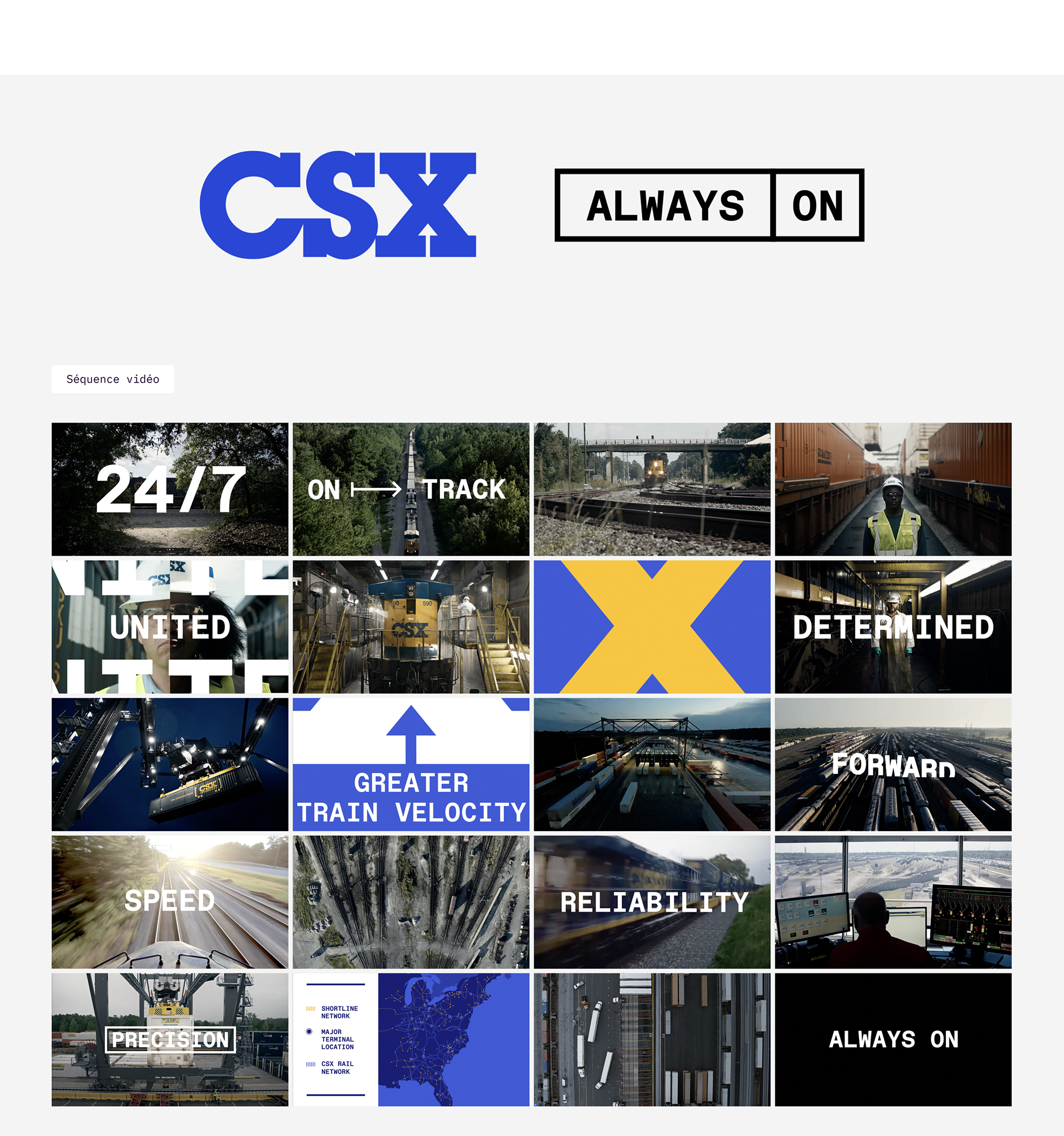 Pour CSX, une des plus grandes compagnies de chemin de fer d’Amérique, j’ai été mandaté par Cossette pour concevoir une série de vidéo corporative. Réalisation Sébastien Dugay.